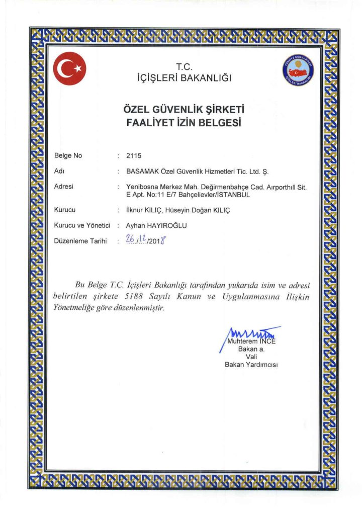 Basamak Özel Güvenlik, 26 Haziran 2004 yılında yürürlüğe giren 5188 sayılı yasa ile belirlenmiş olan tüm temel şartları yerine getirmiş ve tüm yasal izinleri almıştır. İş ve yaşam alanlarınızın, ailelerinizin, çalışanlarınızın ve müşterilerinizin can ve malları üzerindeki riskleri minimize etmek amacıyla, mesleki açıdan zorunlu olan güvenlik eğitimlerinin yanı sıra iletişim, psikoloji ve son teknolojiye sahip olan ekipmanların hizmet sırasında aktif ve doğru olarak kullanılabilmesi için verdiği opsiyonel eğitimlerle de insan gücünü sürekli geliştirmektedir.